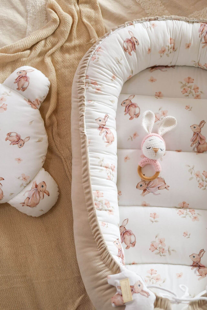 The Bunnies with Bows Baby Nest is a gentle, beautifully crafted essential that supports calm routines and comforting rest throughout the early months.