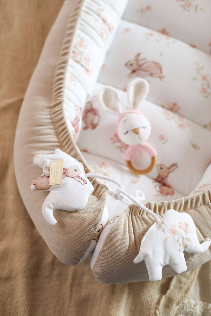 The Bunnies with Bows – Light Beige nest features a sweet, premium printed cotton base paired with plush velvet sides, combining comfort with a charming nursery look. Lightweight and easy to move around the home, it’s also a great option to take along when visiting family or travelling — helping your baby settle in a space that feels familiar wherever you are.